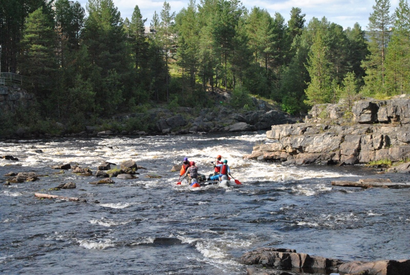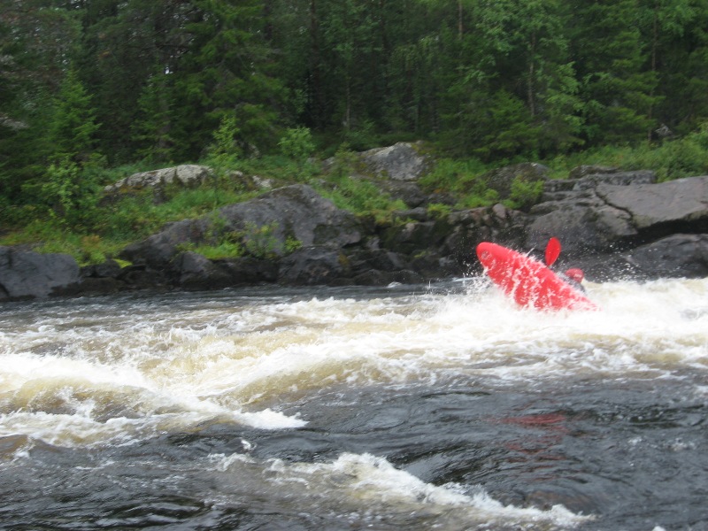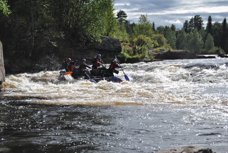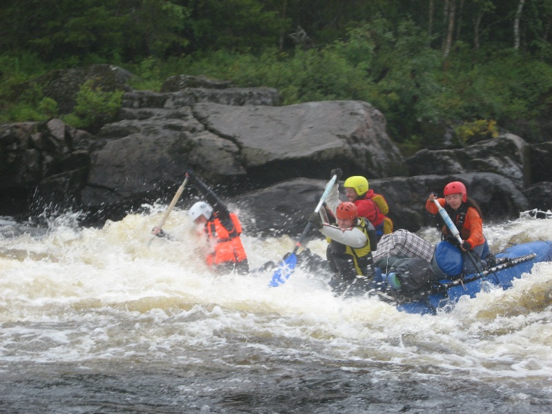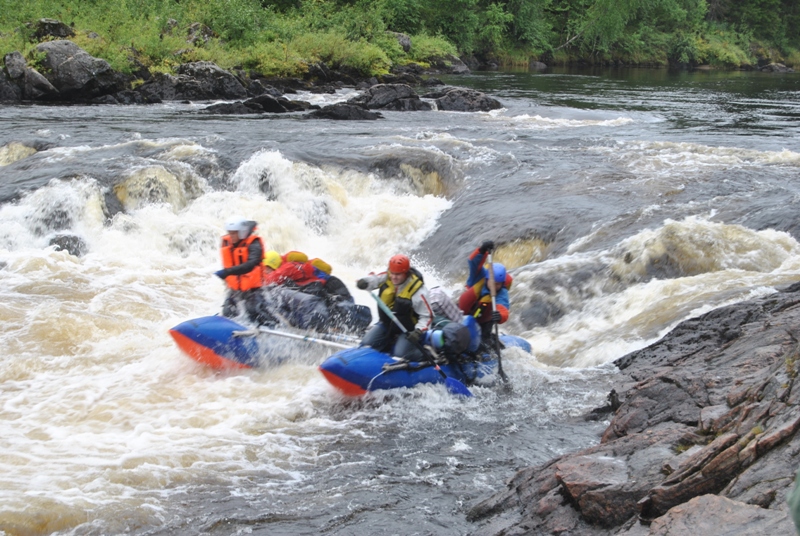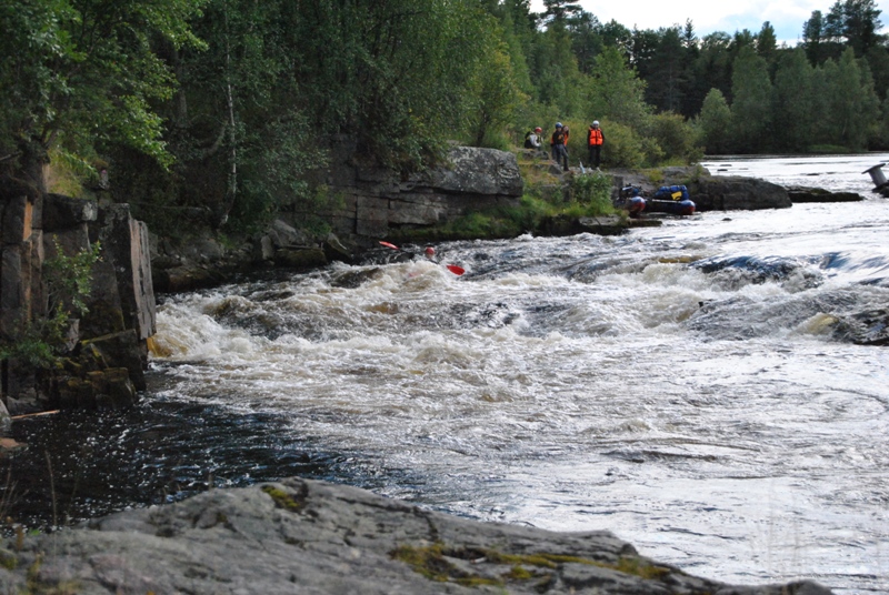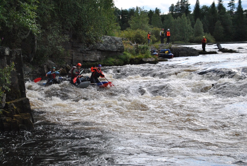 Зачалились к скалам ЛБ. Осмотр показал, что порог образован полуобливной скальной грядой поперек русла. Прохождение правой частью русла осложнено не обливными острыми скальными обломками. В левой части русла ближе к центру слив водопадного типа около 2 м с котлом за ним, левая часть которого (вплотную к скалам ЛБ) выполаживается, образуя гладкий слив шириной около 2.5 м с отбойным валом от скал ЛБ, сваливающим вправо к котел. Ну так как в котел, да еще и с проглядывающими из под струи острыми зубами, попадать особо не хотелось, решили, что рисковать нам незачем, пойдем по языку максимально прижимаясь к ЛБ, а участники женского пола на данном препятствии ограничатся фотосъемкой. Перекусили, поставили съемку и страховку спассконцами по ЛБ, усилили экипажи более опытными участниками и приступили к прохождению порога. Все экипажи выдержали намеченную линию движения и прошли препятствие без эксцессов.