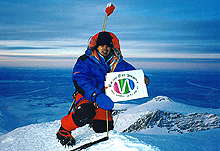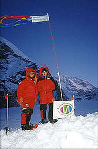 но это уже роли не играет. . . . Через 1,5 часа вышли на предвершинный гребень, до макушки 10 минут. . . из-под горы выпархивают два самолета. . . возможно кто-нибудь снимает на видео и фотокамеры, и мы размахиваем флагами, и самый большой из них «ВИДЕОИНТЕРНЕШНЛ». .