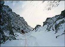 При ухудшении погоды сможем пересидеть в какой-нибудь трещине, но если пойдем по пути подъема по гребню, то в случае усиления ветра окажемся там, где несколько погибших здесь во время спусков зимних восходителей. . . несколько неопасных падений во время одного из которых, как потом выяснилось после рентгена, Док порвал связку на плече, но смог отработать весь спуск до конца. . . до темноты спустились в пещеру над Бейсином, где нас ждал Саша. . . Все эти дни у Александра здесь мела пурга, и он днем и ночью ставил будильник на два с половиной часа и через каждый такой промежуток времени откапывал вход. . . начало спуска, с высоты 3000м опять пухлый снег и приходится снова топтать траншею, позже оказалось что в некоторых местах снега прибавились почти два метра. . . не «достали» еще одну пещеру с запасом бензина и продуктов. . . три часа идем в полной темноте по глубокому снегу, иногда сводит ноги от нагрузки. . .