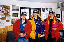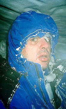 Поэтому сейчас я взял лестницу и тащу ее на себе держа поперек направления трещин. . . . Все рейнджеры и гиды высказывались категорически против нашего варианта с обувью и очень настойчиво рекомендовали сменить наши ботинки на американские военные ботинки, которые всегда использовались в таких экспедициях. Но при том, что эта обувь считалась самой пригодной для восхождений в такие морозы, почти в каждой команде были серьезные обморожения. Будучи упрямыми русскими мы не стали ничего менять. . . Во время выкапывания второй пещеры для ночлега я совсем случайно не провалился в громадную трещину, в которую «влез», копая снег. И еще было бы веселее, если бы я чуть-чуть не дошел до дырки и успел бы построить все жилище, а потом мы залезли бы туда все и оказались неожиданно намного ниже. .