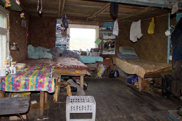 До следующей ночевки никаких особенностей не было. Стали попадаться моторные лодки у зимовеек. Ночевали за 15 км. до деревни Новой (N71 44 47.3 E100 56 22.9). Лил непрекращающийся сильный холодный дождь. Стоянка была у очень хорошей зимовки. Часть группы решила ночевать в палатке рядом с домом, а часть – в самом доме. Протопили печку и высушили все, что было мокрым.