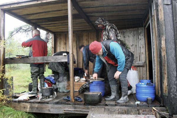 Есть следы регулярного пребывания местного населения. В одном из домов в сарае снегоход. Сделали фотосейсию в шубе из оленьих шкур. Растопили коптильню и приготовили сначала горячего, а потом и холодного копчения сигов и хариусов.