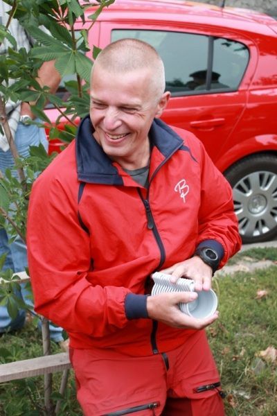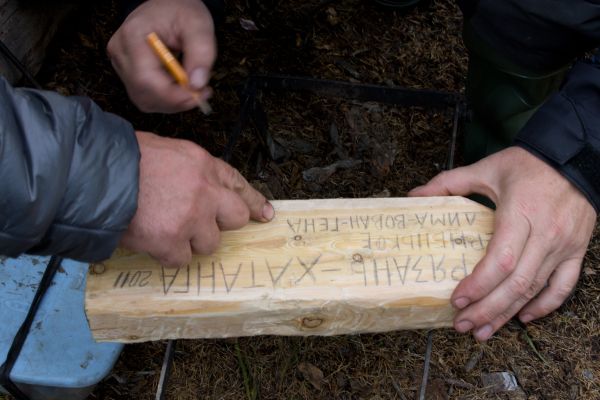 Уровень воды поднялся очень сильно, и перейти речку вброд без веревки не представлялось возможным. Мы отнесли часть вещей до брода. Решено было сделать дневку, дабы дождаться спада воды. Дождь закончился. Температура воздуха поднялась до +16. Светило солнце. Мы, пользуясь наличием свободного времени, вырезали памятную табличку по типу «Здесь был Вася».