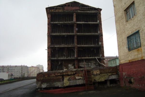Все дома многоэтажные. Построены на сваях. Делается это для защиты от «вечной мерзлоты». А те дома, чьи сваи «вечная мерзлота» практически выдавила из земли, не восстанавливаются, а бросаются. Люди переселяются в другие дома или переезжают в другие города.