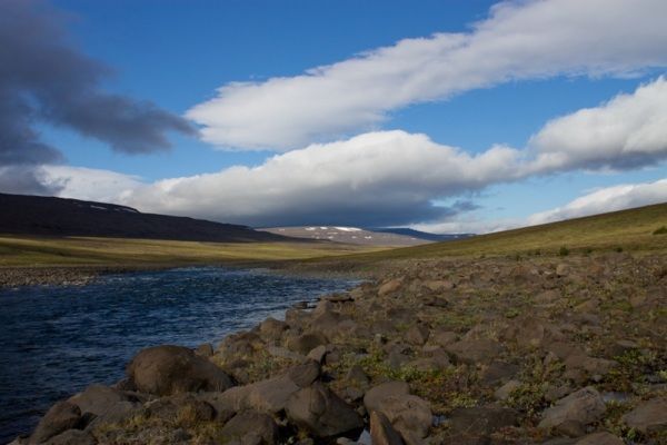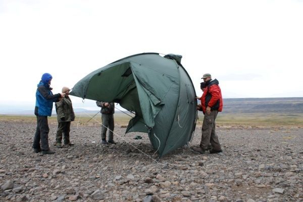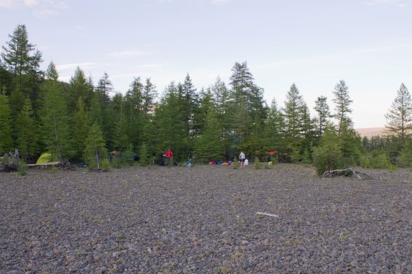 Разгружаемся и остаемся одни на сотни километров. Плато встречает нас пронизывающим холодным ветром, но сухой погодой. Температура воздуха +14. Мы ставим палатки, обкладываем их камнями (колышки забить не во что – везде галька). Ловим первого хариуса, готовим еду на бензиновой горелке.