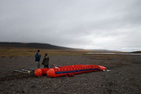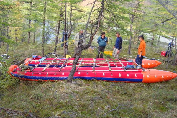 Строим катамаран. С собой пришлось привезли полную раму, так как деревьев здесь нет: высадились мы в арктической пустыне. И нам надо было умудриться не поломать катамаран до р. Аяна где усиливаем раму деревом для установки мотора.