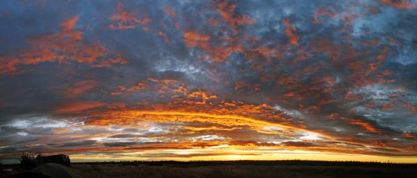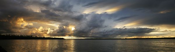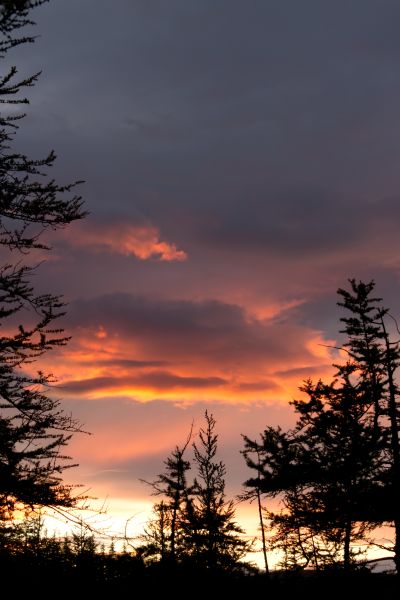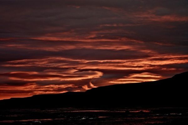 Там то и дело мелькают всполохи молнии. (Что так же странно, как северное сияние в средних широтах). С другой стороны радуга и голубая даль. Там, где черное небо, совершенно отчетливо понятно — разыгралась буря. Вечер постепенно переходит в розовый закат. К счастью, буря нас обошла стороной.