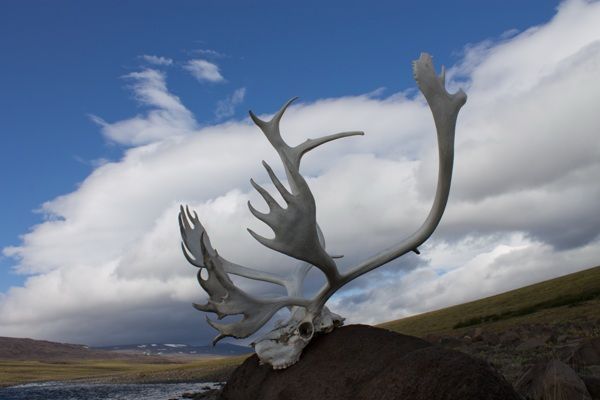 Здесь уже появляются маленькие кустарнички и мхи. На поляне много места для палаток. Но прошел дождь. И посередине образовалась огромная лужа, куда упало весло адмирала вместе с сохнущими на нем вещами. Провели спасработы по изъятию вещей из огромной лужи. На стоянке были найдены оленьи рога. Снова готовили на горелке.