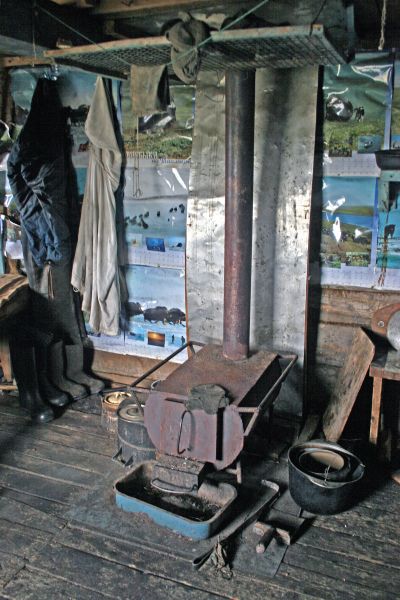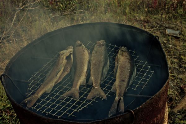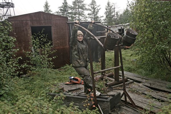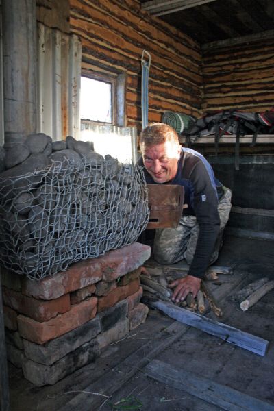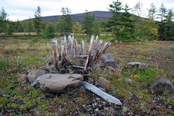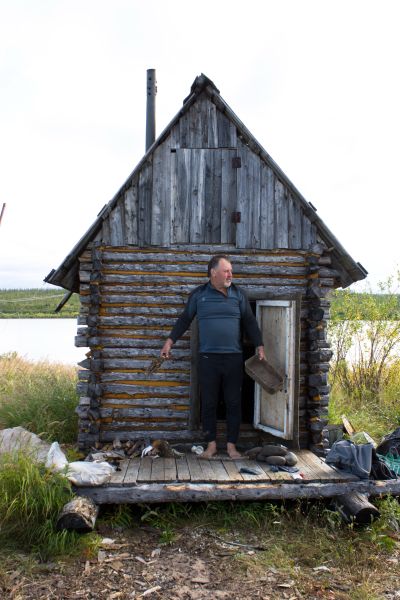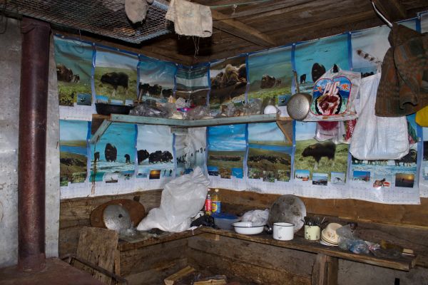 Есть следы регулярного пребывания местного населения. В одном из домов в сарае снегоход. Сделали фотосейсию в шубе из оленьих шкур. Растопили коптильню и приготовили сначала горячего, а потом и холодного копчения сигов и хариусов.