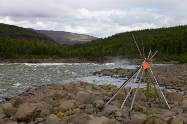 Завалов нет. Встречаются несложные перекаты. Встали на ночевку у левого притока р. Калтымы в точке с координатами (N69 49 34 .1 E93 47 36.1). Место для ночевки отличное. Обжитая поляна с кострищем, на любое количество палаток. Удобное место для чалки и переноски вещей в лагерь находится выше впадения р. Калтымы.