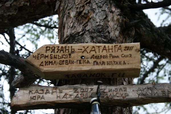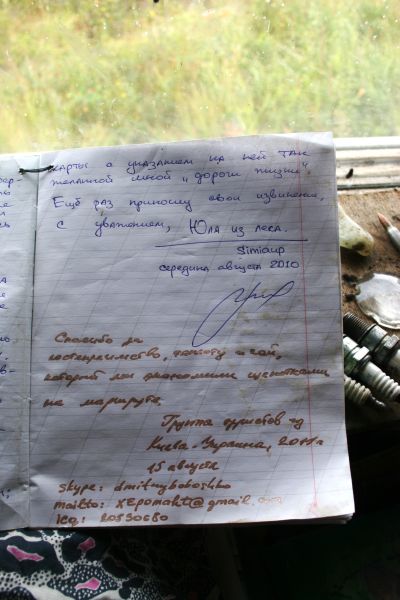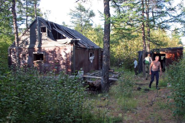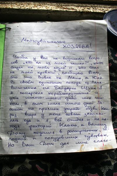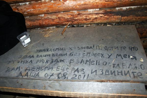 По пути осмотрели бывший кордон заповедника, расположенный на левом берегу, почти напротив устья р. Хукэлче (№69 55 13.0 Е 94 49 42.9). В полуразвалившемся домике видим надпись девушки Даши, которая собиралась повторить путешествие Юли Вершининой, в одиночку прошедшей путь от оз. Лама до п. Волочанка в 2010 году. О приключениях Юли Вершининой можно прочитать в ее ЖЖ http://simiaup2.livejournal.com/20761.html , а о судьбе Даши, шедшей буквально за несколько дней до нас, известно только от местных жителей, что ее подобрала группа туристов и привезла в Волочанку. Изба бывшего кордона заповедника представляет собой малопригодное для проживания сооружение. Крыша проломлена упавшей лиственницей, стекла в окнах выбиты.