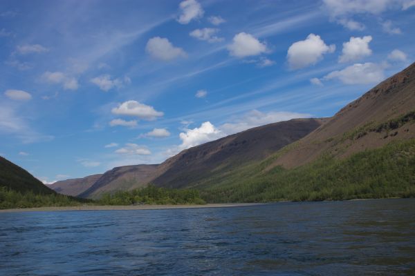 После кордона течение на реке заметно слабеет, в огромном количестве встречаются подмытые и оторванные от берега части суши, в том числе с деревьями. Предположительно, из-за изменения климата тают куски вечной мерзлоты, находящиеся под берегами. Местами очень мелко. На ночевку встали ниже кордона заповедника (N69 55 43.7 E94 51 05.0). Температура воздуха +16. На берегу у стоянки свежие следы волка, и оленей.