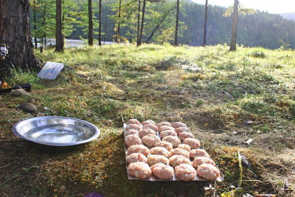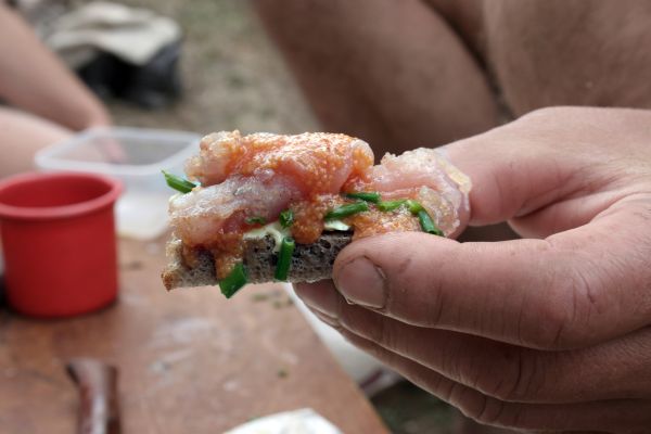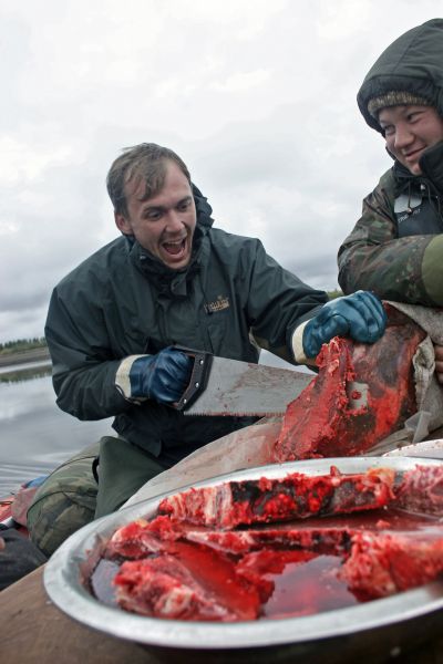 Там же мы купили замороженного в вечной мерзлоте оленьего мяса. Прямо на катамаране делали строганину из мяса и рыбы с соевым соусом.