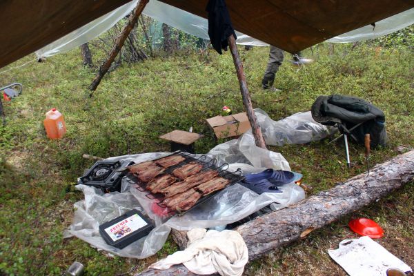 На следующий день трое человек принесли остаток снаряжения. Остальные строили катамаран. Температура воздуха +19. Хариусы ловятся в огромном количестве, делаем сугудай. Строевой лес имеется в достаточном количестве. Укрепляем раму катамарана.