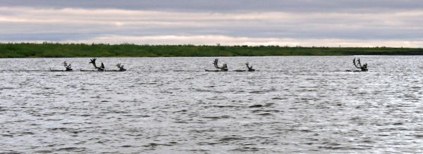 От места ночевки до с. Хатанга река расширяется до невообразимых размеров особенно после слияния с р. Котуем. При подъезде к Хатанге противоположного берега почти не видно. Кульминацией последнего дня сплава стали 7 оленей, переплывавших реку прямо перед нами.