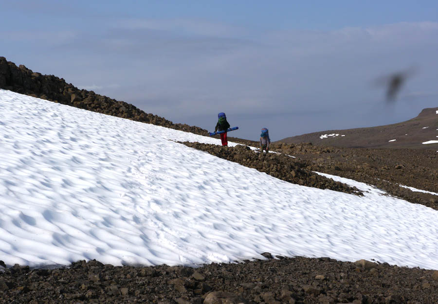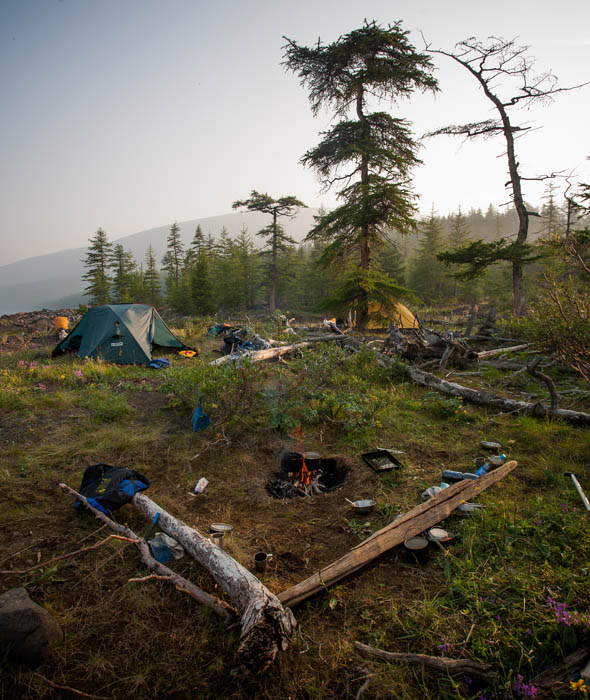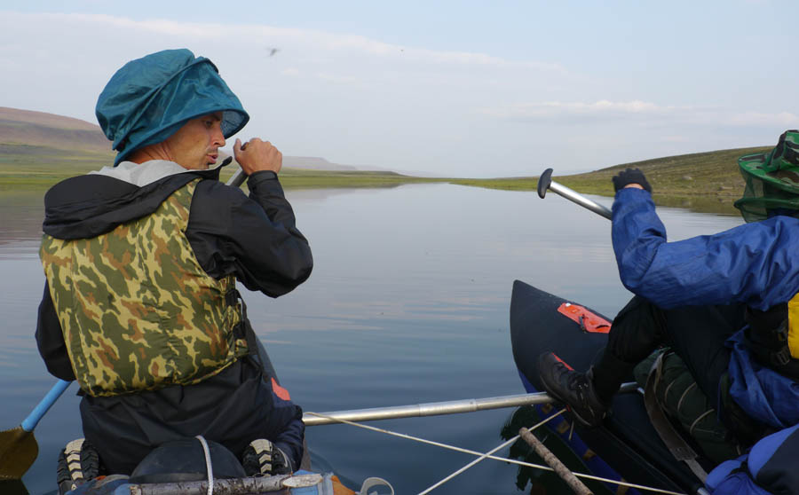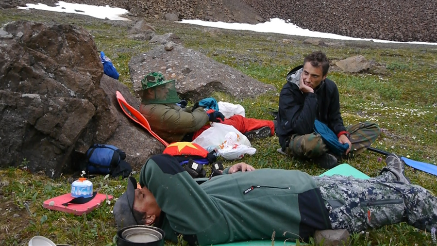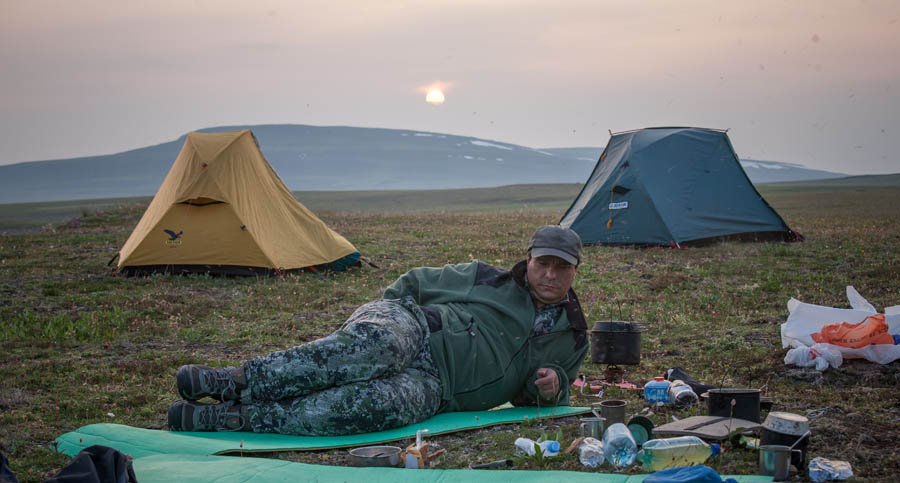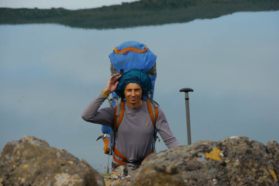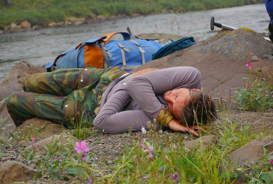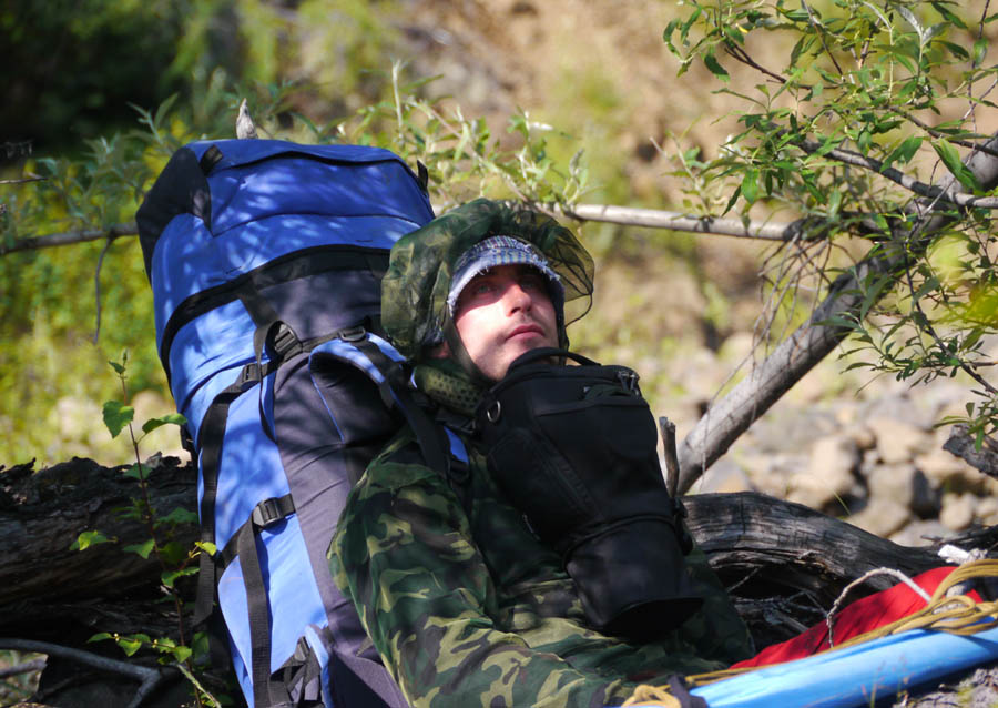 Обнаруживаются проблемы с ногами у Саши Викулина. Новые неразношенные треккинговые ботинки Salomon пережимают какую-то мышцу. У Вадима, похоже, кожа вырабатывает дэту, поэтому он может лежать спокойно среди тысяч комаров и не париться.