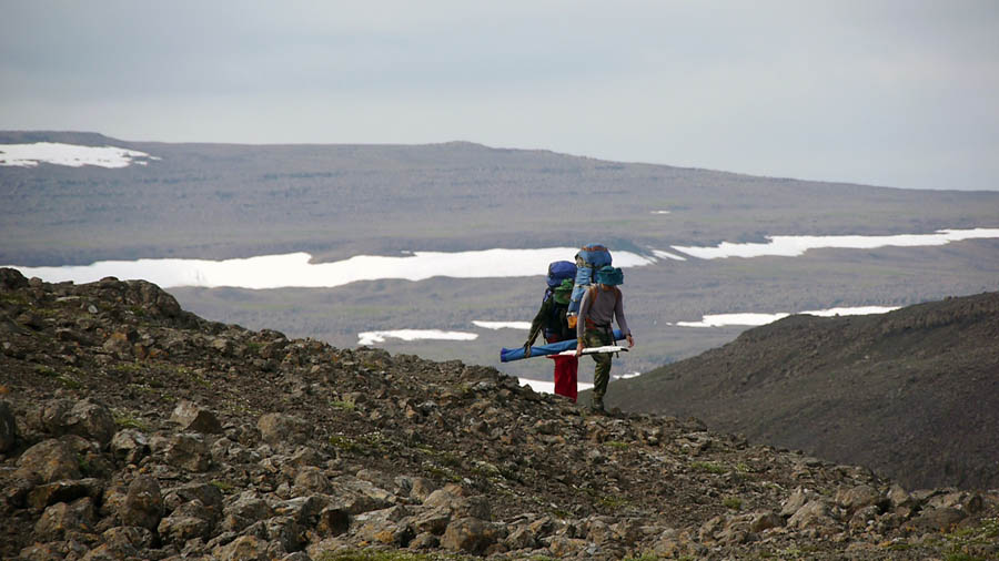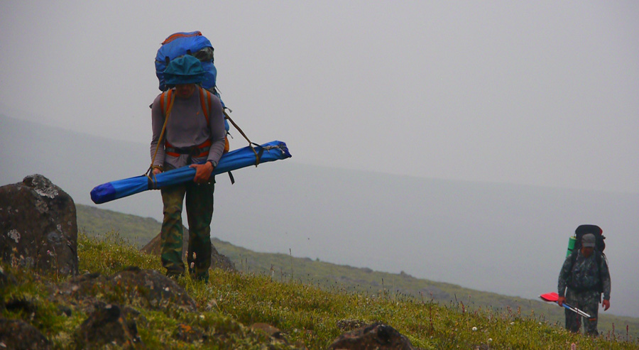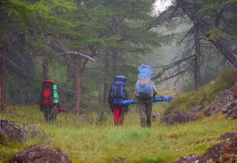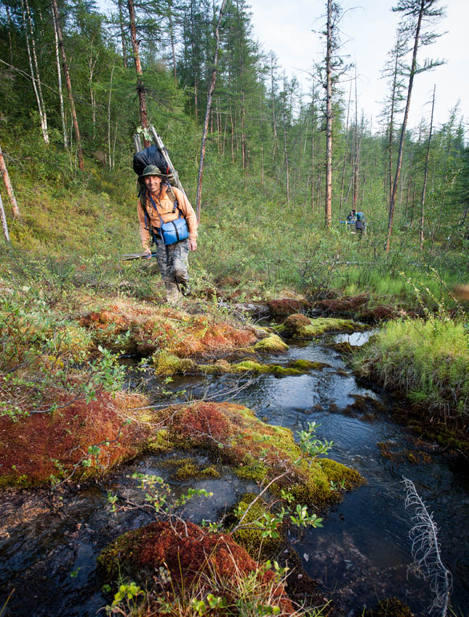 Причалили… 10 минут на приветствия соскучившимся по нас за 3 года комарам — и в путь! Первая часть маршрута до реки Б. Ханамакит хорошо знакома трем участникам нашей команды. Рюкзаки через некоторое время наливаются грузом, кажется, что с каждой ходкой в них прибавляется вес — идти в первый день всегда очень тяжело.