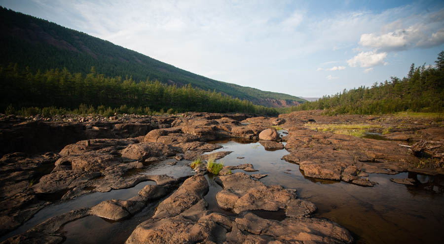 Воды в реке действительно меньше чем в 2009 году – больше приходится проводить катамаран на перекатах. Много проводок и мелких шивер. Шиверы длинные — просто сад камней какой-то. Главным методом прохождения было заранее правильно зайти в шиверу, чтобы меньше таскать. Споры на эту тему у нас начинались заранее и вероятность угадывания была статистическая — 50/50. Но после притоков река понесла всё быстрее и быстрее к Аяну.