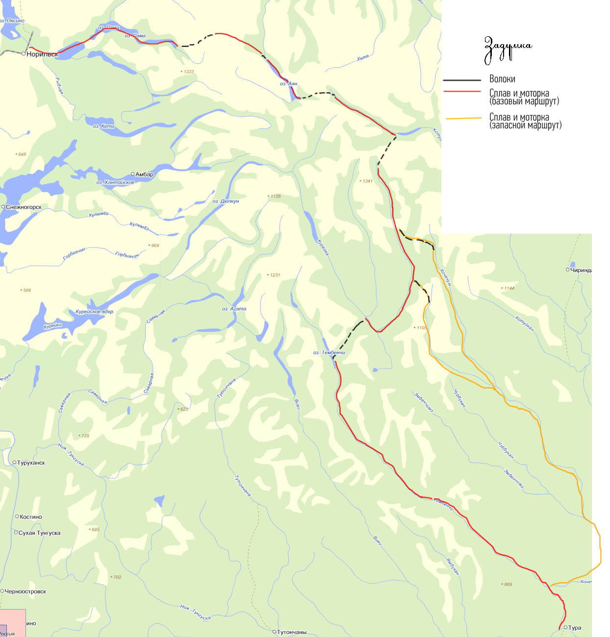 План в этот раз был не просто большой, а я бы сказал — неприлично большой 🙂 . Давняя задумка Вадима — дойти до Бельдучанского водопада через верховья Котуй и Курейки. С озера Аян уйти на Котуй, затем перейти на истоки Курейки, дойти до впадения Бельдучаны и посмотреть водопад. Затем уйти на р. Тембенчи и сплавиться до места, откуда нас сможет забрать моторка из Туры. По самым экстремальным подсчетам у нас выходило 21-23 дней активного маршрута. Это без дневок и возможных катаклизмов. Мы с Марковым покряхтели — очень не хотелось оставлять семьи надолго… Но что делать — идея есть идея. Почему бы и нет?