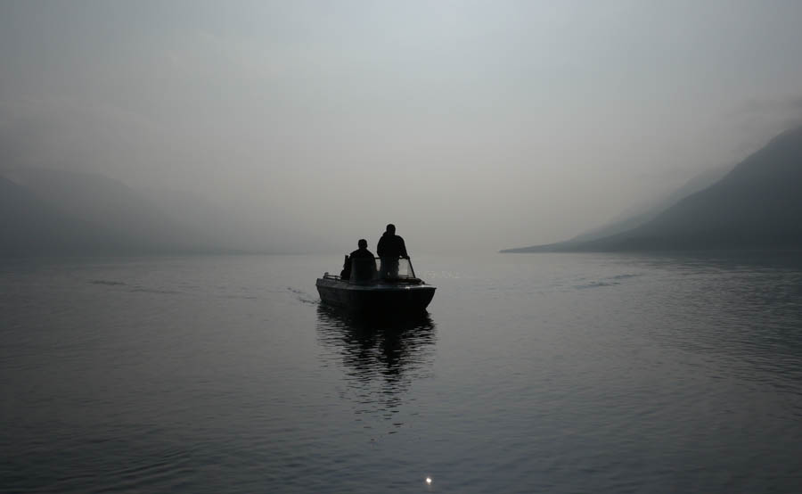 До конца дня монотонно гребли. Немного напрягает дымка на озере снижающая видимость окружающих красот. В районе 23.00 встали на ночевку.