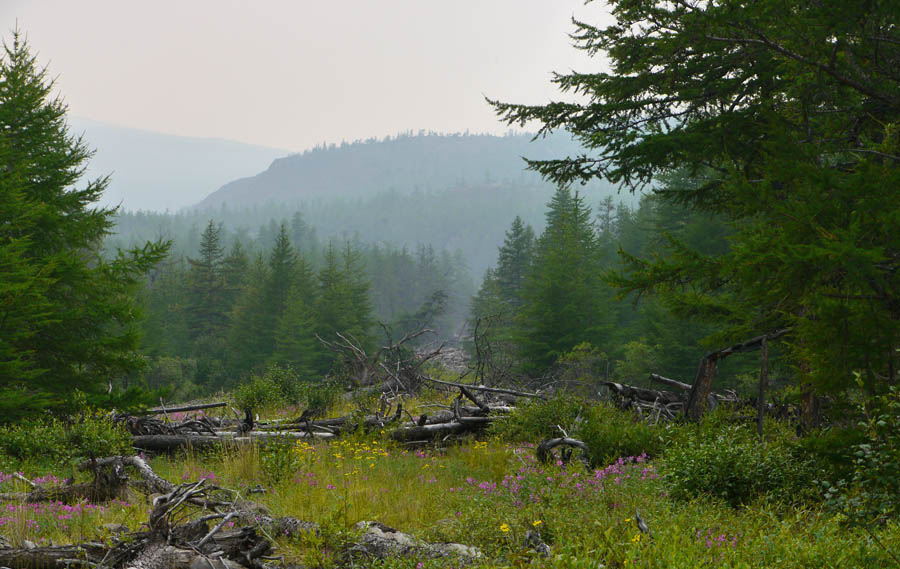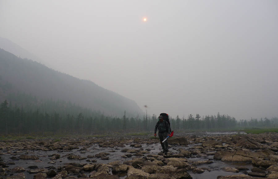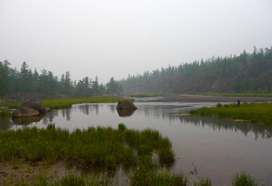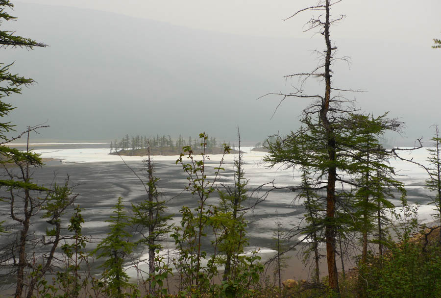 Проснулись поздно, около 10.00. Собрали кат и двинули. Озеро Аян в легкой дымке. Чувствуется запах гари.