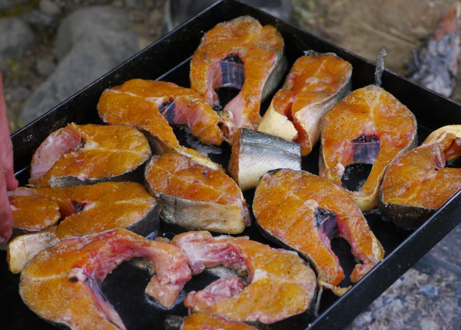 Вадим поймал трёх хариусов, которые моментально были переведены из живого состояния в состояние еды в виде сугудая на ужин. Рецепт этого блюда простейший: рыбу нашинковать кусочками, уложить в котелок, добавить лук, посолить, полить уксусом, перемешать и оставить на 15-60 минут (в зависимости от голода). По истечении этого времени перемешать и подать на стол.