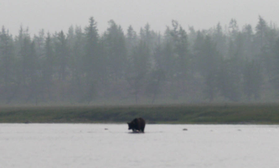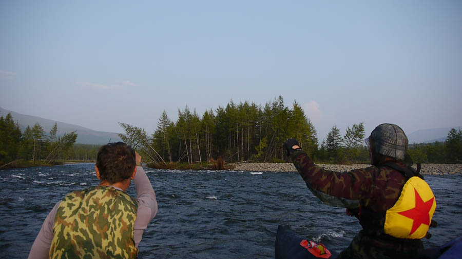 В середине дня заметили молодого медведя, ловящего рыбу на перекате. Мишка любезно освободил фарватер реки, учесав быстро в лес. Только пятки сверкали. Чувствовалось, что он был несказанно перепуган таким большим плывущим чудищем.
