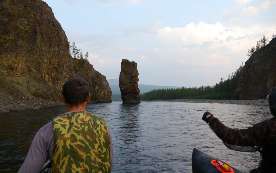 За несколько километров до притока Делочи, откуда мы собирались уйти на Курейку, начался красивый каньонный участок с несколькими несложными прижимчиками на поворотах. На выходе из каньона — символ реки Котуй — останец ввиде пальца.