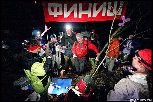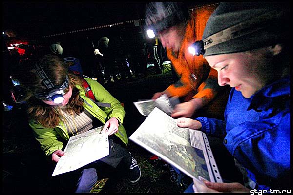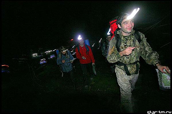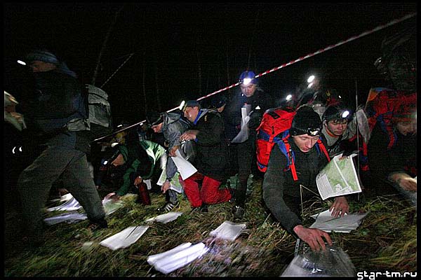 Итак — ночь позади, но вокруг еще темно и холодно. Кривясь и тихо ругаясь натягиваю мокрые носки. И вот самая неприятная процедура позади, на очереди — кроссовки. Но не тут то было. Мокрые кроссовки за ночь просто замерзли. В лед. Я решил, что раз их нельзя одеть то в них можно допрыгать до костра, где они оттаят и я их одену. Как я был наивен в тот момент, когда засунув ноги в ботинки, шагнул из палатки. Т.е. шага в чистом виде не получилось. получился полет. Короткий и некрасивый. Мокрые кроссовки примерзли к мокрой же опавшей листве. Спустя некоторое время я все-же грелся у костра, отодрав кроссовки вместе с куском местной флоры. Постепенно просыпается народ, получаем карточки, завтракаем и к 7 утра выдвигаемся на старт.