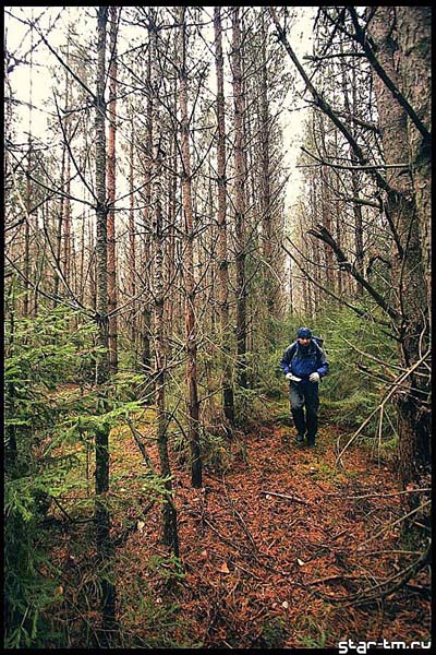 Но вот искомый столбик найден. Им оказался самый обычный квартальник, вообще без лишних обозначений и каких либо символов принадлежности к ММБ. Только число 14. На осознание смысла ушло секунд 15, после чего из плана были четко вычеркнуты 1 и 4 КП. Дальше мы начинаем обходить все КП по очереди против часовой стрелки. Судя по полному отсутствию людей и тропинок мы движемся в лидерах. На взятие спецэтапа у нас ушло два с половиной часа. Выходить решили на просеку, ведущую на юг, но ее не нашли, а вернее нашли, но существенно позднее.