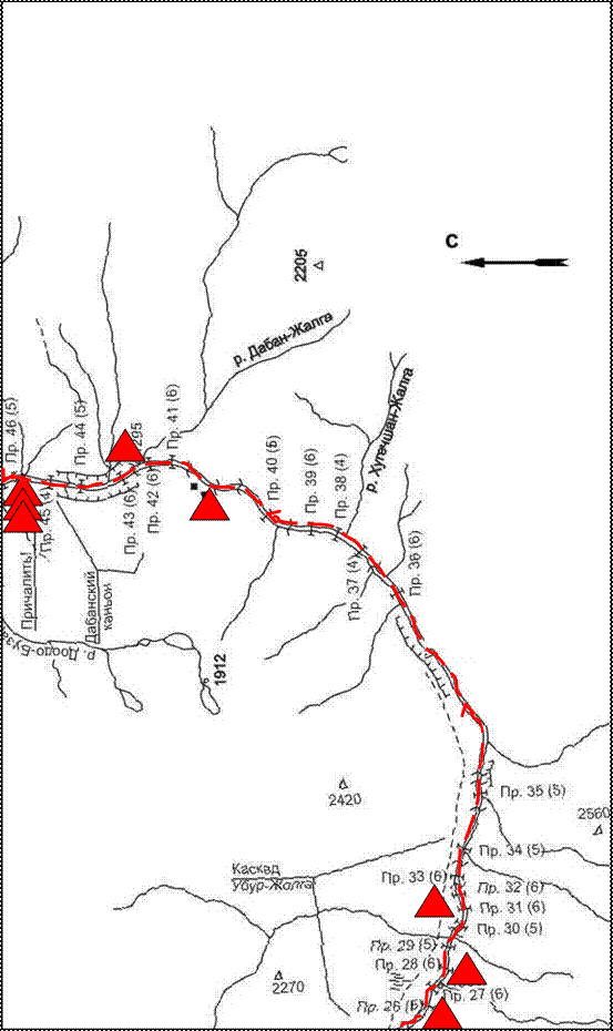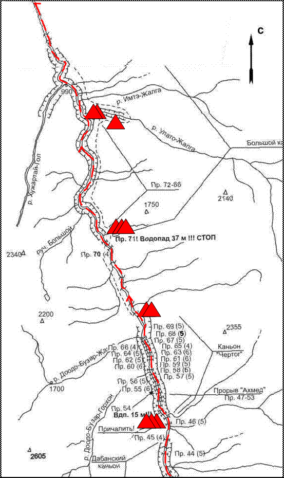Препятствиями, определяющими категорию сложности похода, являются: пороги Ильчирского каскада (13(5С к.с.), 14(Рвач»(6А к.с.)), 15(6А к.с.), 16 (водопад «Нефрит» (6В к.с.)), 18(6А к.с.), 19(5С к.с.)), порог 24(6А к.с), порог 25(5С к.с.), пороги Каскада «Убур-Жалга» ( 26(6А к.с.), 27(«Десятка»(6А к.с.)), 28 («Очко»(6А к.с.)), 29(5С к.с.), 30(5С к.с.), 31(6В к.с.), 32(«Островной»(6А к.с.)), 33 («Лоток»(6А к.с.))), порог 36(6А к.с.), порог 39(6А к.с.), порог 40(6А к.с.), порог 41(«Хаос»(6В к.с.)), пороги Дабанского каньона (42(«Трёхступенчатый» (6А к.с.), 43(6А к.с.)), порог 46(5С), пороги каньона «Чертог» (57(5С к.с.), 58(Пупок»(6А к.с.)), связка 59÷60(«Дельфин»÷«Бобслей»(6В к.с.), 61 («Лапа»(6А к.с.), связка 62÷63( «Колючий»)÷64 («Карман») (6С +к.с.), 68(5С к.с.)), пороги «Последнего» каньона (91(«Жёлоб»(5С к.с.), «Финита»(6А к.с.)).