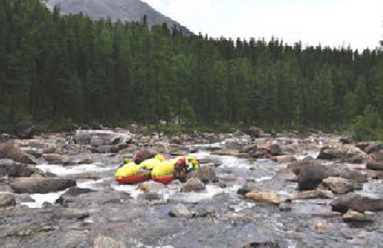 Только эта благодать кончилась очень быстро, река вновь уперлась в частокол камней. Это начало «Ильчирского» каскада. Утром было принято решение об организации базового лагеря, заброски туда снаряжения и дальнейшего прохождения на разгруженных катамаранах. Ходка с рюкзаком, весом около 50 кг, по заболоченной дороге, развороченной гусеницами вездехода, здорово подорвала мое здоровье. Опухли колени и переклинило поясницу (как позже выяснилось — не выдержала поджелудочная железа). От второй ходки меня освободили, и я пошел готовить катамаран к сплаву.