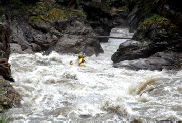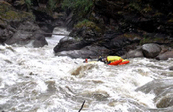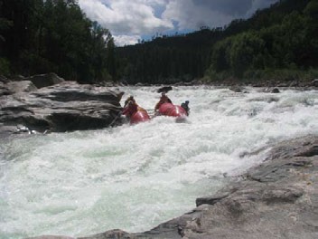 Но этого не произошло. Отбойка, все же, помогла, и, врезавшись кормой в правый берег, мы успели развернуть носы по струе. Новая бочка, снова полет, и, вроде бы, кульминация пройдена, только не расслабляться! Нас тут же потащило на левом повороте на правобережную скалу. Уйдя с большим трудом от прижима, мы увидели перед собой слив и огромную бочку черезувсю рек . После прижима скорости у нас не было, зато было желание выжить, мы только и успели выставить катамаран в слив.