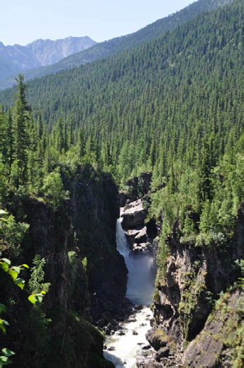 Через час спокойной гребли мы подошли к следующему обносу. Впереди был 37-ми метровый водопад. Когда я его увидел, то понял, что только ради этого зрелища стоило терпеть все трудности этого похода. С узкой расщелины между скал, вода, под давлением, отвесно падала на дно скалистого каньона. На солнце играла радуга. Настроение было приподнятым и даже предстоящий антистапель, волок и новый стапель, не могли повлиять на переполняющую нас, положительную энергию, исходившую от этого величия. Постояв у памятника погибшим туристам и почтив минутой молчания тех, кто закончил здесь свой путь, мы начали обнос до ручья впадающего справа, по которому планировали спуститься к реке. Тропа на правом берегу была сильно заброшенной и местами даже терялась. Совершив по 3-4 ходки, мы перенесли снаряжение, поставили базовый лагерь и сделали разведку спуска к реке. К сожалению, здесь нас тоже ждали неприятности в виде снежника над ручьем, который преграждал спуск к Оноту. Снег был рыхлый и плохо держал даже без груза, но это обстоятельство не сильно пугало. Рыбаки пошли испытывать удачу. Рыбы выше 37 -ми метрового водопада не было и мы очень надеялись, что теперь сможем пополнить наши совсем оскудевшие запасы. Вечером у костра, когда вся группа собралась (рыбаки вернулись без улова) , был намечен план действий на следующий день – глубокая разведка Большого каньона до порога «Щель» включительно.