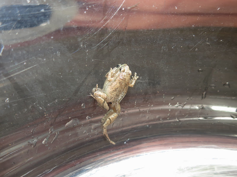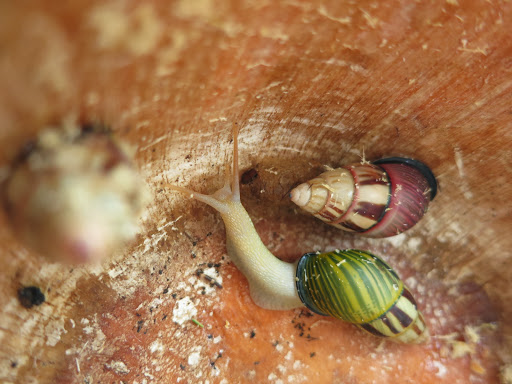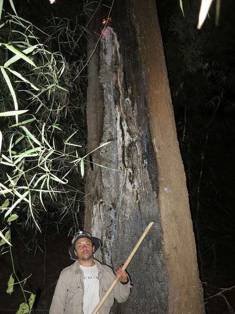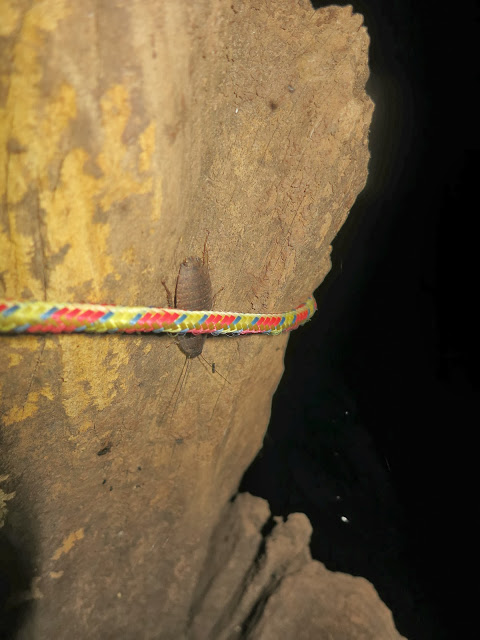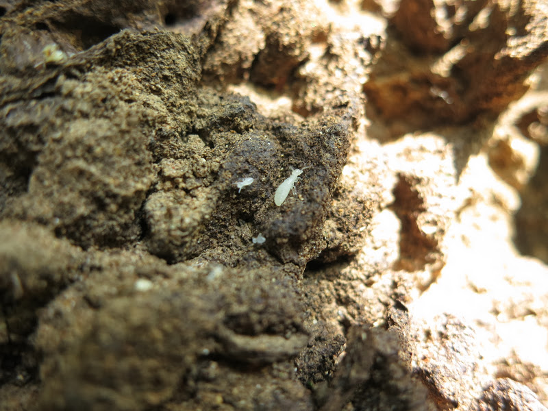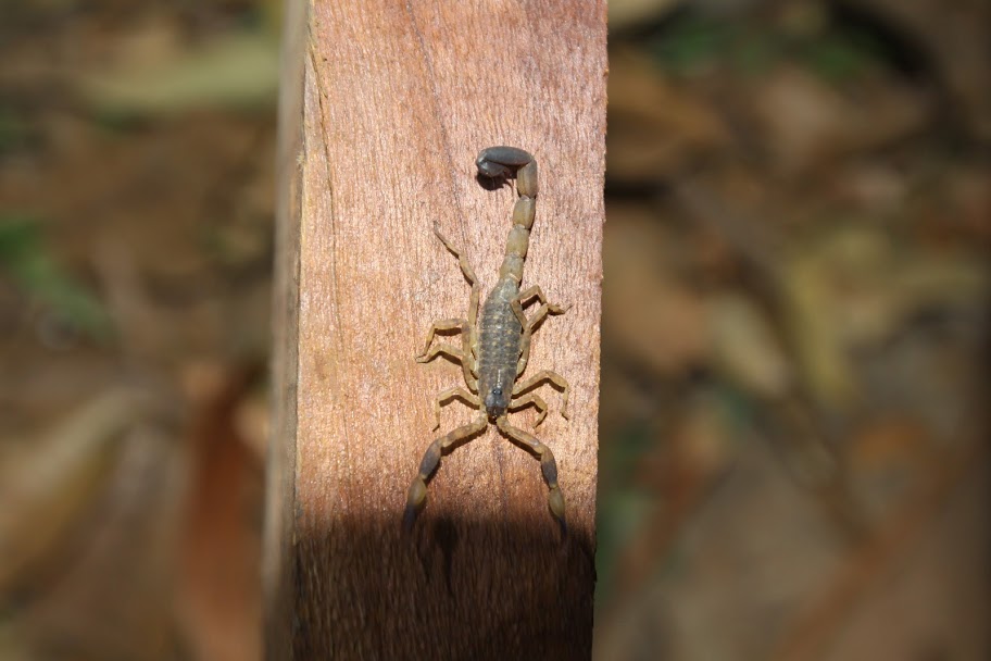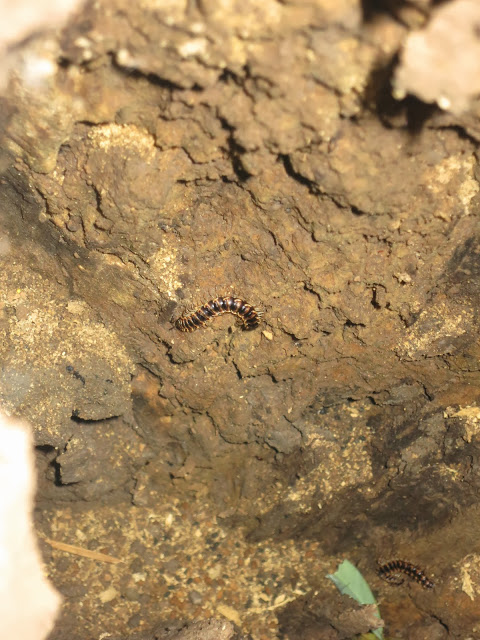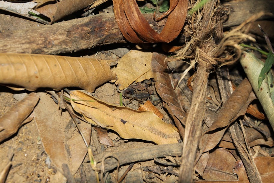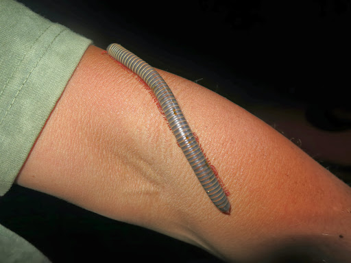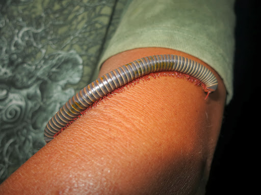 На дне среди трухи копошатся какие-то многоножки, длинные, сантиметров 12 и толщиной с мой мизинец, многоножки поменьше, похожие на сколопендру, ещё какие-то гусеницы… А дальше я уже не могу осматривать спокойно, мне «физиологически» необходимо об этом возвестить миру. 🙂 На мой визг тотчас примчался Олег, любовно схватил самую большую из многоножек, позволил ей свободно разгуливать по собственной руке, дав нам возможность приглядеться к забавному способу передвижения. И лишь когда многоножка устремилась в рукав футболки, Олег решил, что подобному интиму всё же тут не место, и усадил её обратно в общагу.