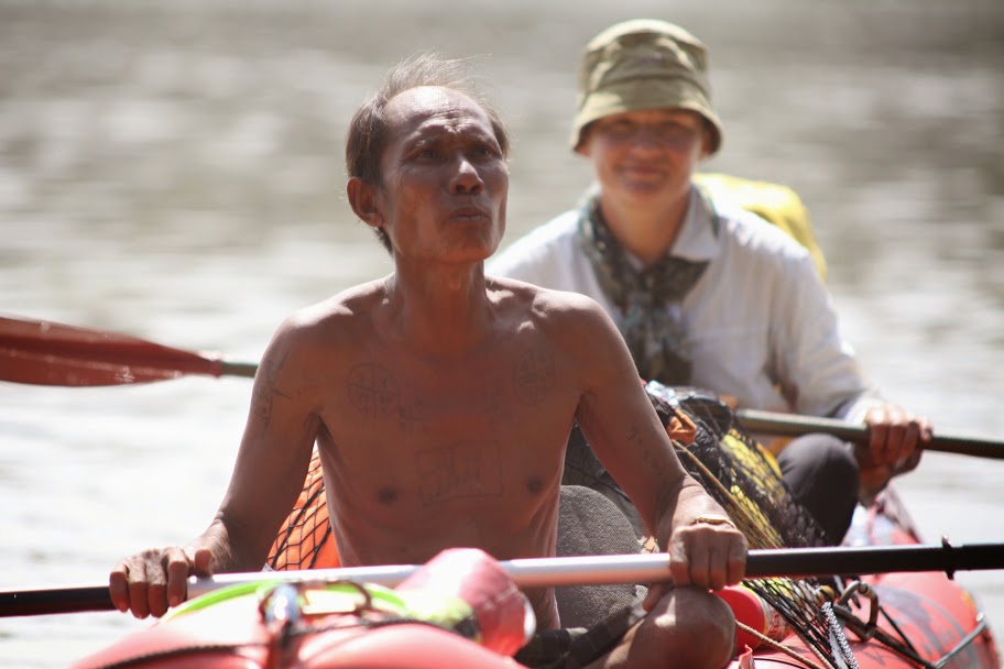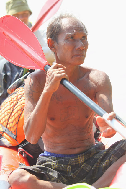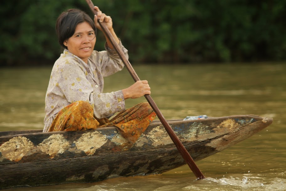 Один кхмер, в возрасте, с несколькими круглыми и квадратными татуировками на груди — оберегами от пуль, как пояснил потом Олег, подошел к нам. Он что-то сказал Олегу, показывая на лодку. Ближе всех к лестнице стояла наша. Олег кивнул, кхмер полез в лодку, уселся на Лёшкино место. Мягко. Понравилось. Он махнул рукой — кто-то подал ему весло. «Лер, он попробовать лодку хочет, иди садись на корму, проконтролируй, а то баржА тяжелая все-таки»- сказал Олег. Я поняла его мысль. Щуплый, с нашего некрупного тринадцатилетнего подростка, да еще на носу, кхмер не управился бы с лодкой никак. Я представила местную лодку — узкая, длинная, как иголочка, хорошо держащая курс, легкая на ходу, так бы и сказала — управится и ребенок. Управлять ей нужно, конечно, тонко. Детей я за этим занятием не видела, только взрослых, но дело тут, конечно, не в физической силе, а в умении. Зато при правильно заданном угле траверса такая лодка способна пересечь реку без потери высоты даже при приличном течении. Вот кренА на ней, конечно, не заложишь, борт течению не подставишь, да упоров бедренных нет. А так — вполне себе скоростное судно, хотя не слаломник, конечно.