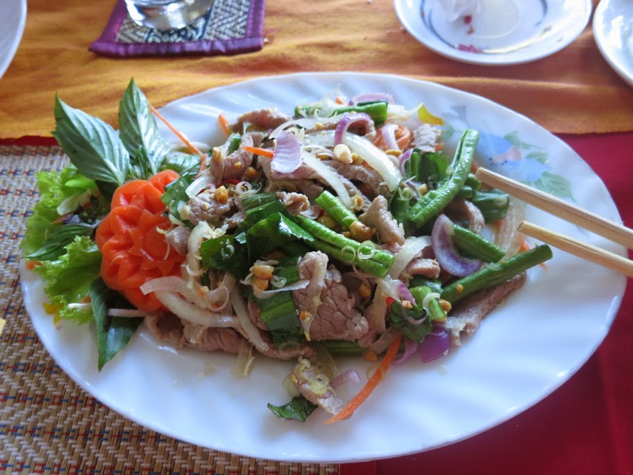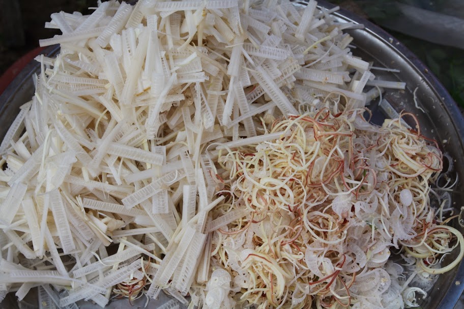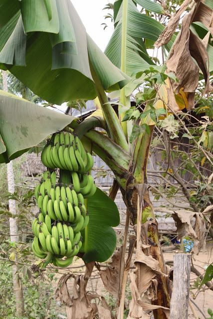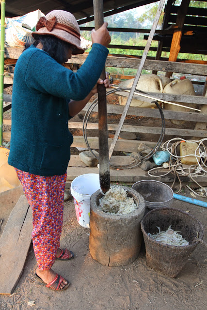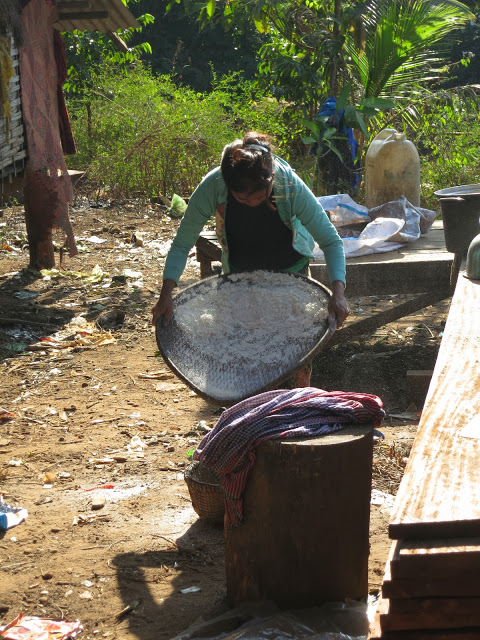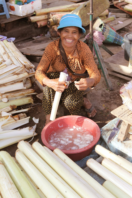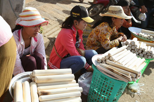 В Краче пробуем местный фастфуд : молодой побег бамбука истончается, чтобы мог открыться как банан, в него напихивается вкусно сваренный рис с фасолью, закупоривается крышкой из волокон пальмового листа. Продается на вес.