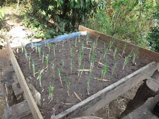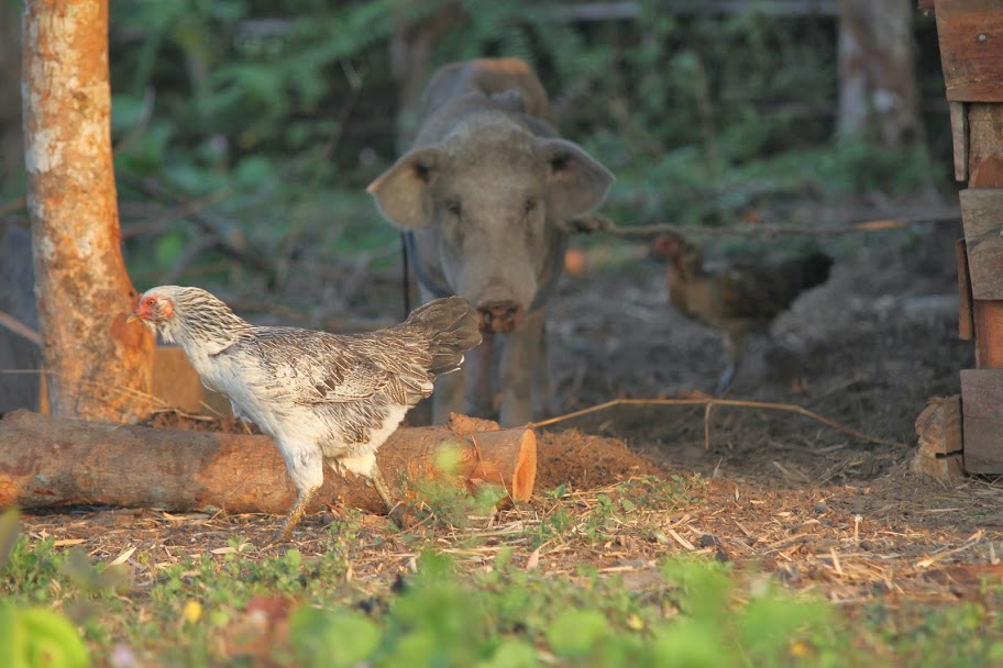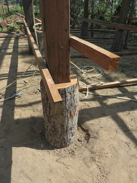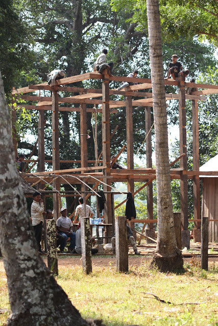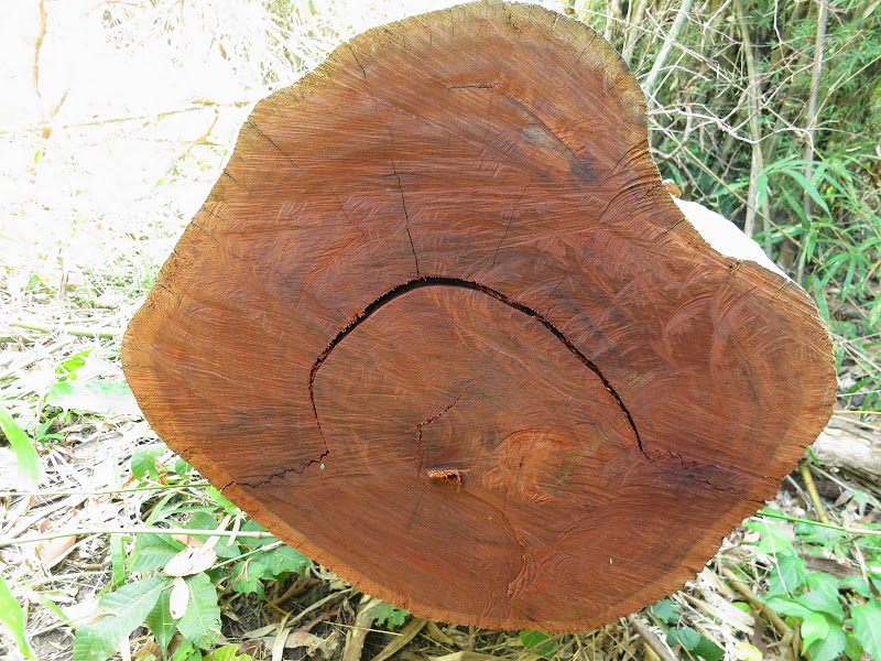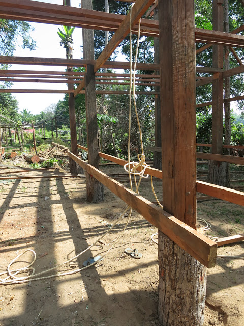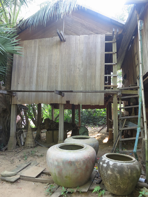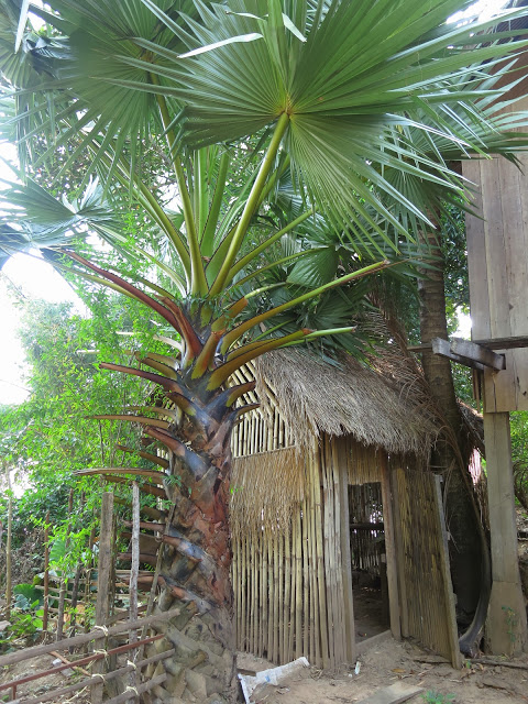 Дома здесь строят из всего, вплоть до тростника и бамбука. Этот дом — целиком из красного дерева. Высокие сваи, под ними типа хоздвор — кувшины, корзины, доски. На сваях — сам дом, в него ведет довольно крутая лестница. Веранда с роскошным столиком, столешница которого — цельный поперечный спил толстенного ствола красного дерева.