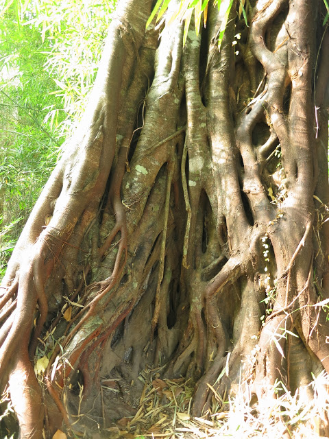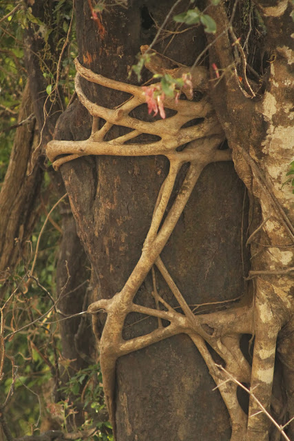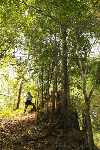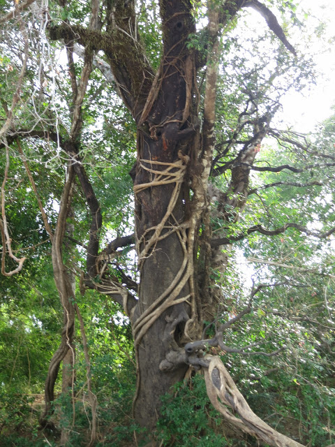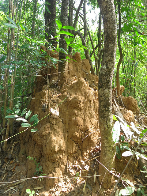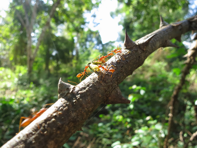 Затем меня заинтересовали бессмыссленные действия муравьев, тащивших помятую, возможно нами же, гусеницу по полукруглой шипастой ветке, изогнувшейся тепличной дугой. Эй, чуваки! Прямиком по земле короче бы было, — стебусь, фотографируя, над ними я, и тут замечаю, что ветку-то дугой держит тоненький ус лианы. А лиана эта сама оплетает дерево над нами.