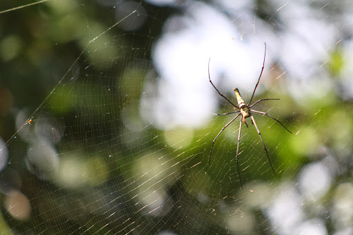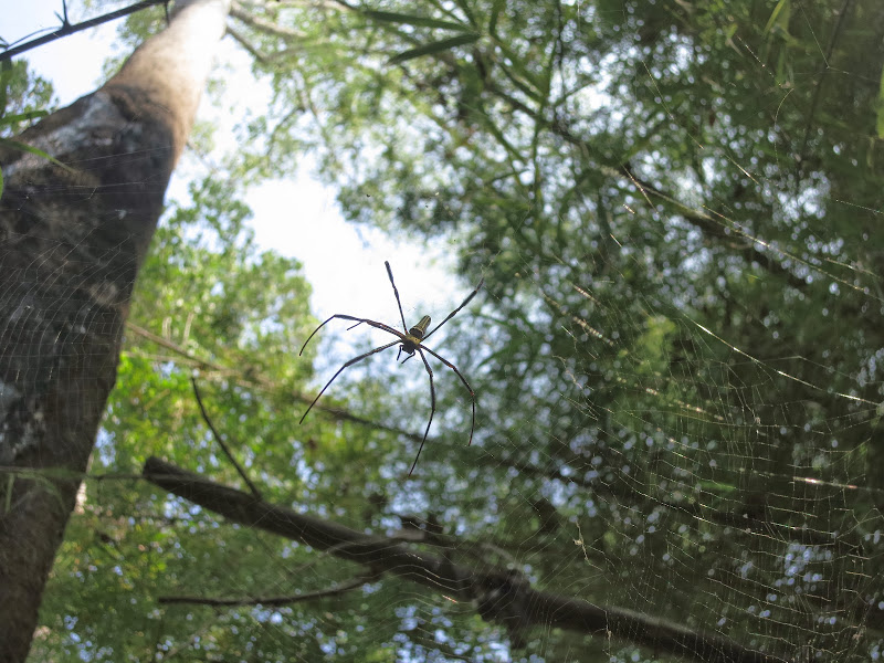 На перетопе деревень нам не попалось, но и на простом тенистом бережку мы тоже нашли для себя интересности. Ну, во-первых, здоровенную нефилу в своей паутине, если не сказать — сетке, увидели теперь все, а не только я. Несколько маленьких самцов тоже располагались в паутине. Интересный гарем наоборот у нефил.