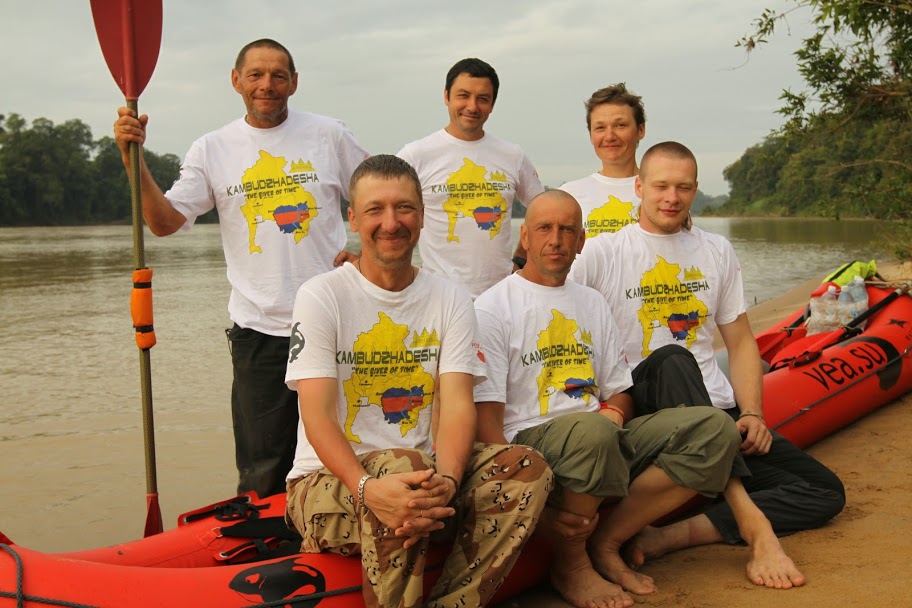 По команде Лёши все облачаемся в наши фирменные белые футболки с жёлтой картой Камбоджи на груди для небольшой фотосессии. Мы тщательно рассажены, каждая рука и нога согласно режиссёрскому замыслу попала на своё место, не заслоняя лодку и надпись на борту : VEA.SU