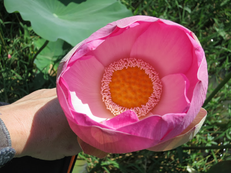 Мелководные разливы проток Меконга плотно заросли этим широколистым растением. Цветы лотоса крупные, с два сложеных вместе больших мужских кулака. Розовые лепестки колышутся на ветру, а в центре, окруженный желтыми тычинками, располагается широкий конус-пестик, тоже желтый.