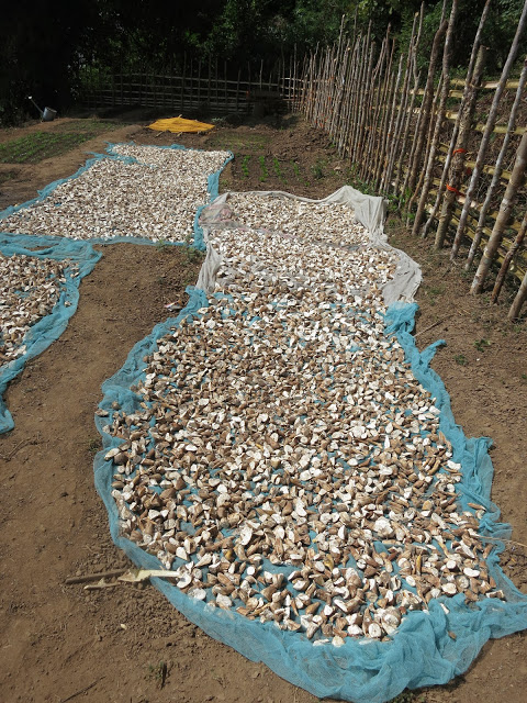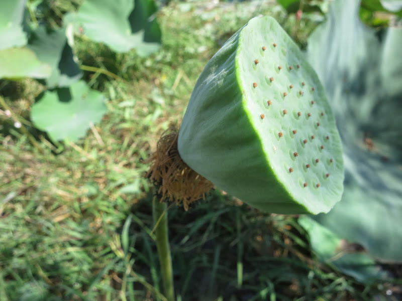 Созревшие пестики зеленого цвета, размером в теперь уже один кулак, этакие небольшие граммофончики. По верхней плоскости, как корзинка подсолнечника, они держат в себе семечки лотоса, похожие на небольшие оливки. Сдираешь зеленую вяжущую кожурку — и ешь на здоровье, на вкус семечки как семечки, только мягкие, сырые. Но в болото за ними конечно не полезешь, их собирают, вяжут по три и тут же у дороги продают проезжающим дети и подростки под присмотром взрослых.