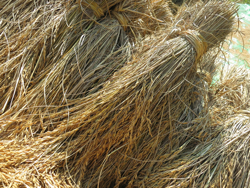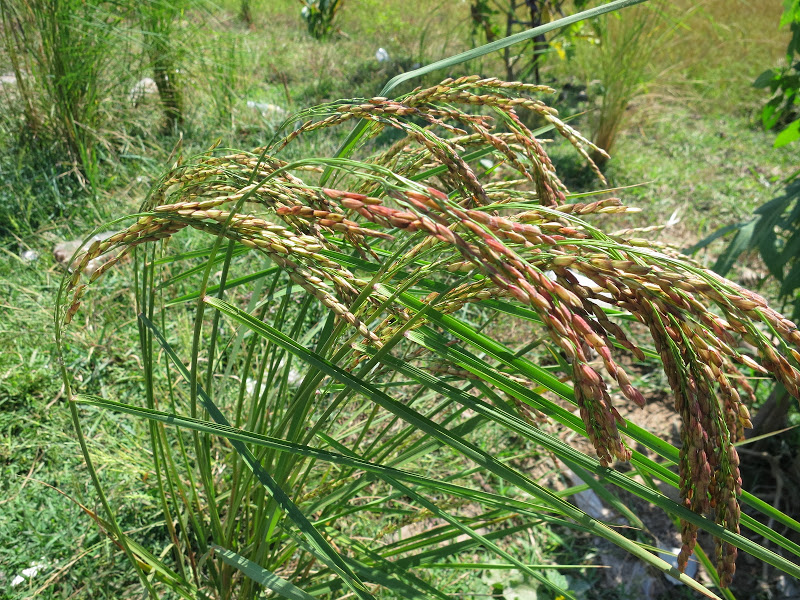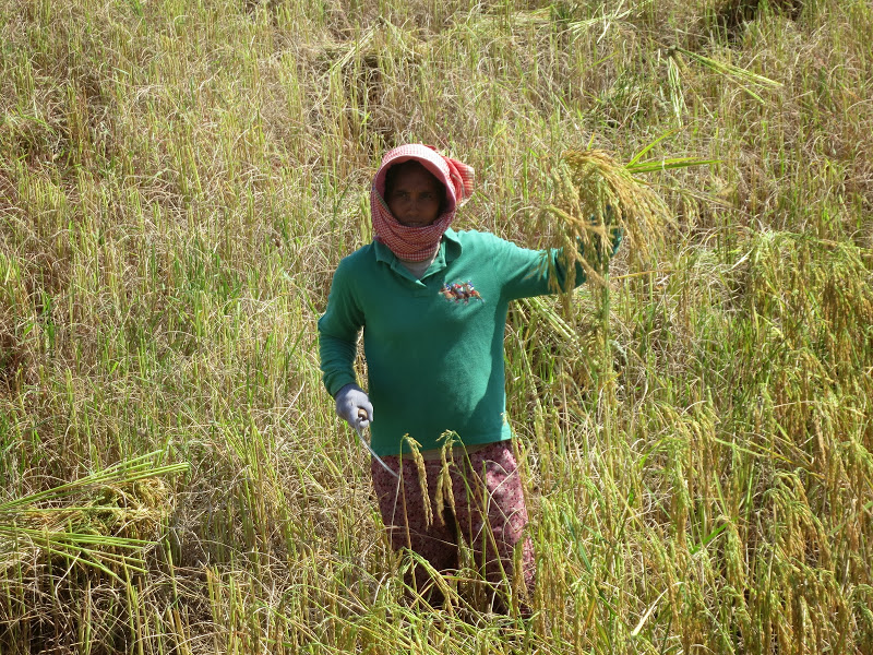 Рис на этих полях уже созрел, тогда как на других полях в низменностях у Меконга его еще сажают. Видимо, в здешнем ровном климате, где нет сильных сезонных скачков температуры и продолжительности дня, можно встретить рисовые поля любой степени зрелости — от посадки (вручную!) рассады пучками по три ростка в одну лунку в жидкую грязь или прямо в воду, до снятия урожая, тоже вручную. На поле воды по щиколотку. Колос здесь высотой по пояс, гнется дугой. Я впервые увидела вблизи колосок риса. Отдельные рисинки в шелухе лепятся на колосе друг за другом.