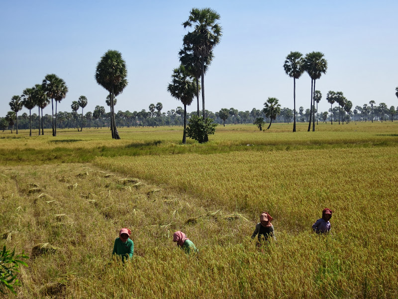 А приключилась у нас вынужденная остановка среди рисовых полей с редкорастущими на межах пальмами. Пока водитель подтягивал гайки на колесных дисках, мы дружно пошли снимать на фото и видео сборщиц риса.