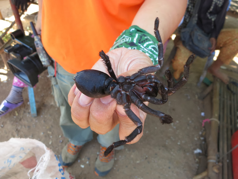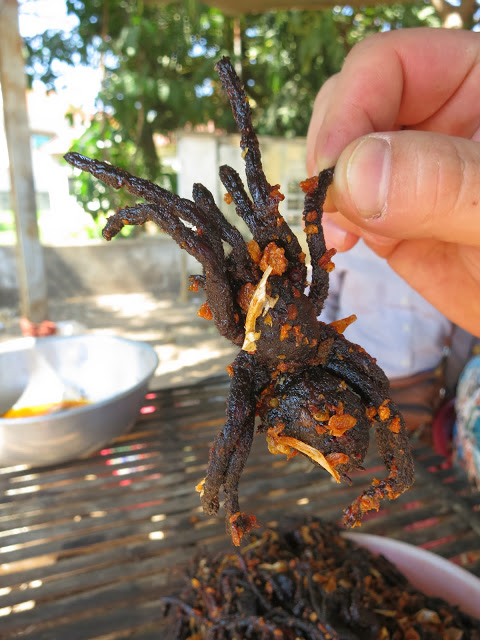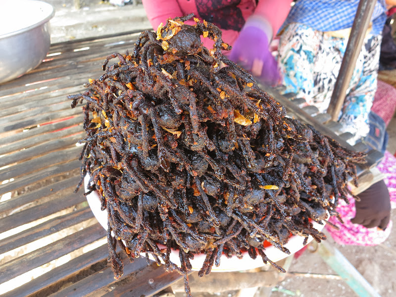 В городке Скун, где мы останавливаемся на обед (мы-то может и потерпели бы с едой до вечера, но водители-кхмеры рулежкой без обеда остались бы недовольны ), на небольшом рыночке в числе прочих деликатесов продаются жареные пауки.