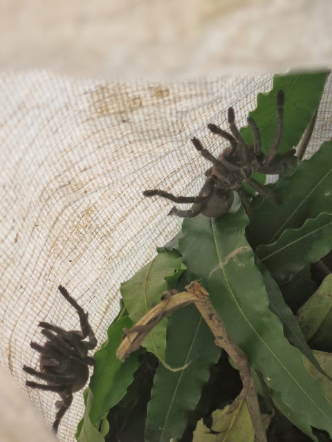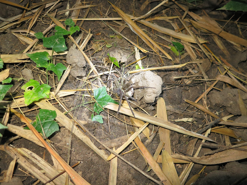 Живые их собратья величиной с ладонь без пальцев ползают в большом мешке с листьями. Олег вынул одного, твердой рукой взяв за верхние сочленения задних паучьих ног, так, чтобы хищные хелицеры не достали до его пальцев. Паук черный, мохнатый. Хелицеры похожи на два острых волосатых клыка длиной миллиметров по 6, направленных в сложенном состоянии к брюшку. Жареный же собрат на вкус оказался своеобразен, причем брюшко вкуснее ножек. Их я еле доела.