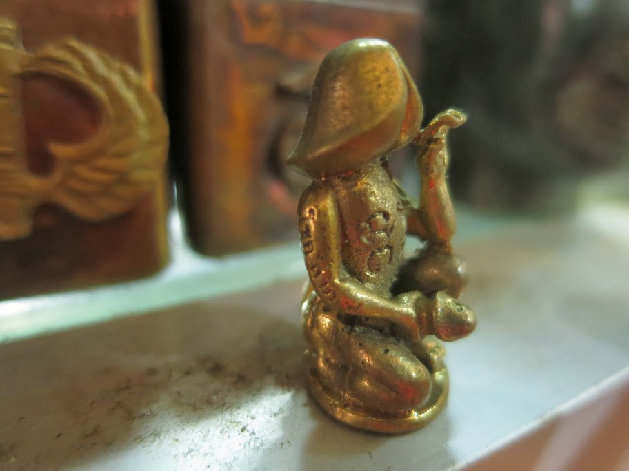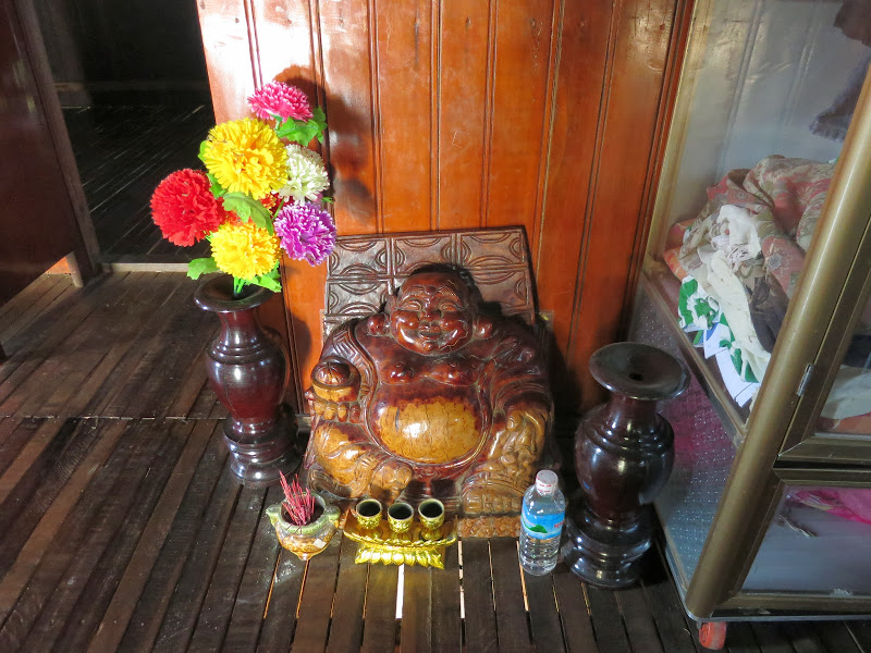 Против входа — веселый и довольный Будда, весь в цветах, со свечками, вырезанный из большого цельного куска догадайтесь чего? Правильно, красного дерева. Над Буддой — большие портреты хозяев дома. Справа — портрет друга Олега, умершего 4 года назад. «А вот и он сам», — вдруг сказал Олег, указывая на деревянную колонну. Мы испуганно переводим взгляд в указанном направлении. На колонне под портретом хозяйки висит крошечный мешочек. В нем — прах хозяина дома. Оказывается, в землю кхмеры не хоронят.