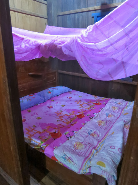 Центральное помещение разделено перегородкой, передний зал просторен, в нем справа и слева две огромных кровати красного дерева с москитными пологами, пока что поднятыми.
