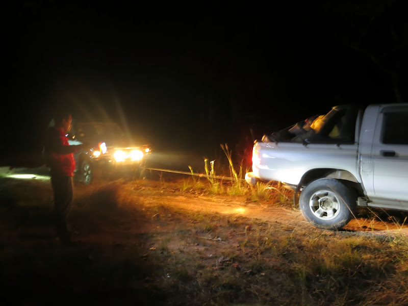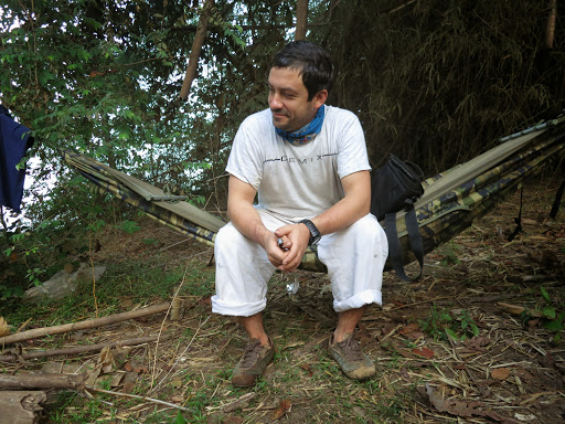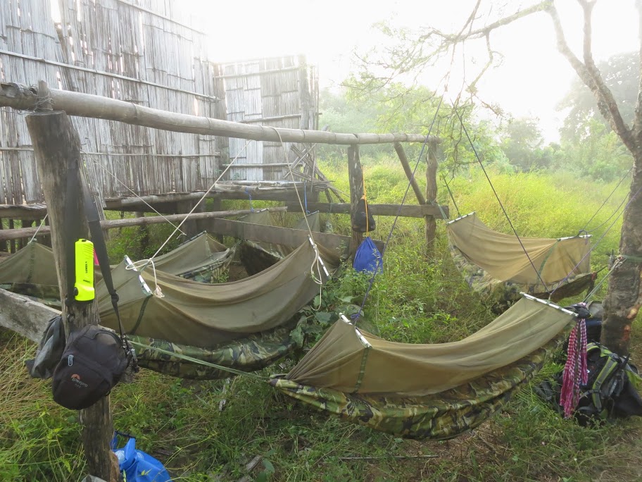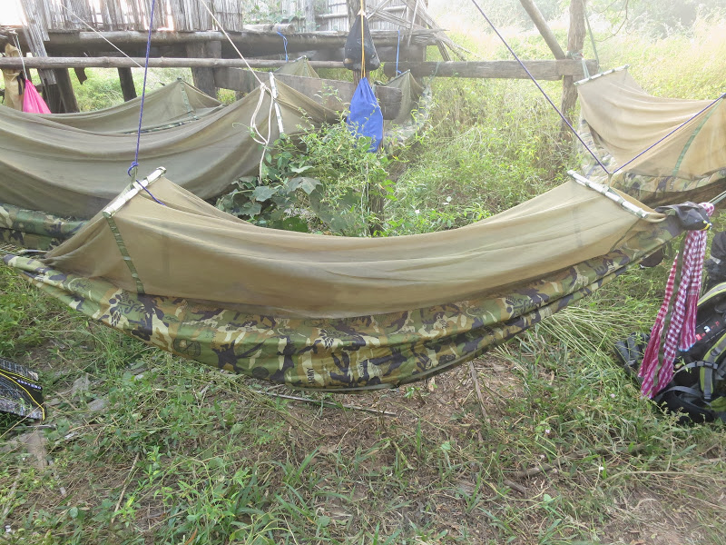 Гамаки должны были заменить палатки, в которых в здешнем климате душно. Гамак — это толстый стеганый капроновый низ и тонкий сетчатый полог-верх. Гамак можно натянуть между двух деревьев (это у нас называлось «пойти повеситься»), прицепив к веточкам полог, чтоб слегка оттопырить его вверх. Либо растянуть импровизированными колышками на земле, подвесив- оттянув вверх только полог. Получается индивидуальная маленькая палаточка. Застегивается она на горизонтальную молнию. Залезаешь, застегиваешься, руки под голову и можно без помех наблюдать ночное звездное небо или растущую почти на глазах луну. Сетка от дождя не защищает, но дождя быть и не должно — сухой сезон. Но всё же групповые тенты с собой есть.